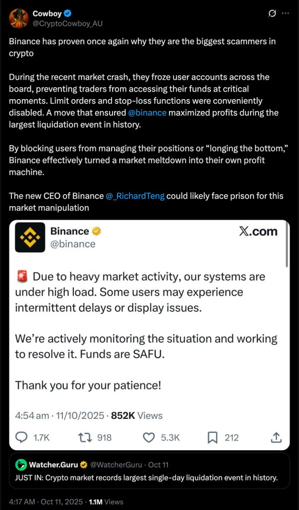 As prices plunged, Binance’s trading systems became overloaded. Some users reported frozen accounts, missed stop-losses, and delayed trades.
